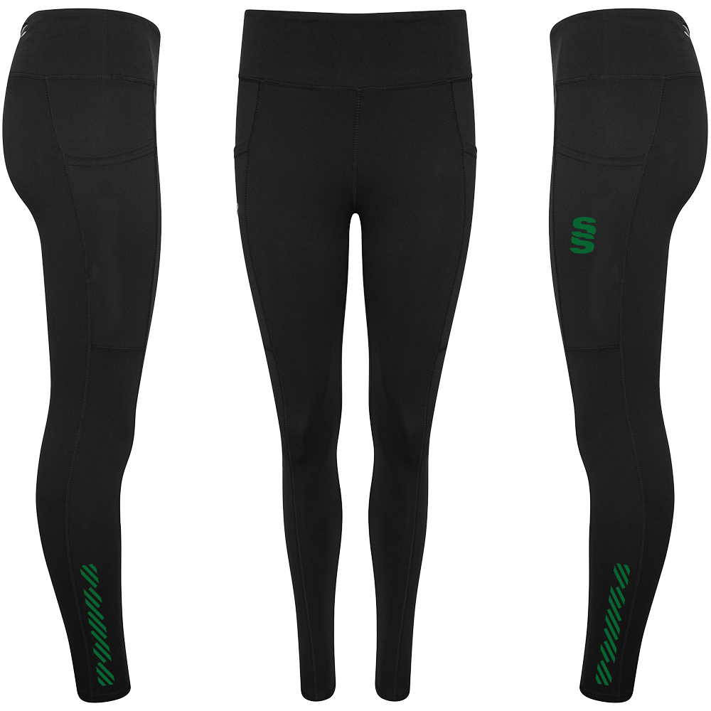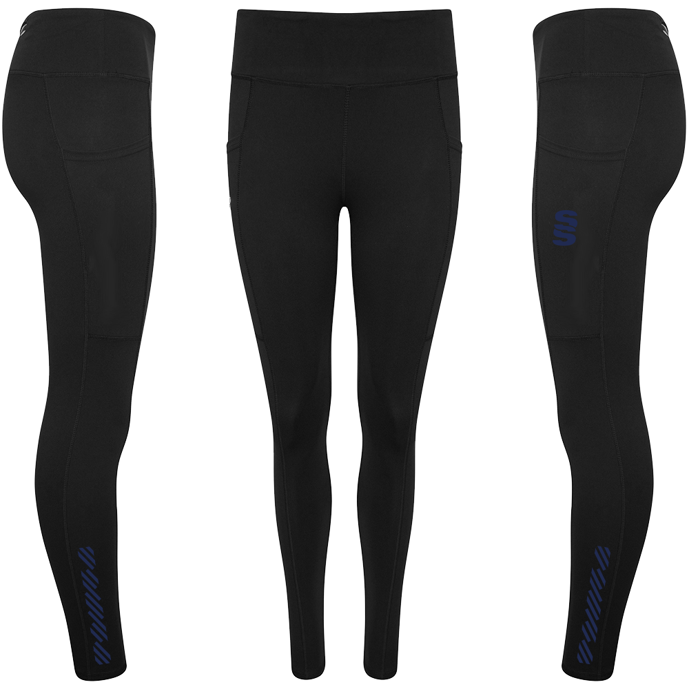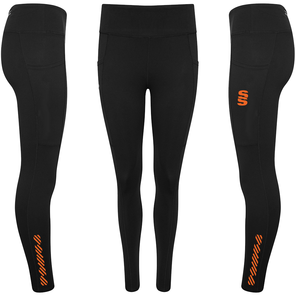 The Performance Full Length Leggings are made of fantastic, comfortable quality  85% Polyester and 15% Elastane. There no grinding on the material when stretched. They feature two side pockets for mobile phones and two smaller pockets (one with zip) for personal belongings, with an inner pocket for a key. To finish, a printed Surridge SS logo is situated on the left thigh.